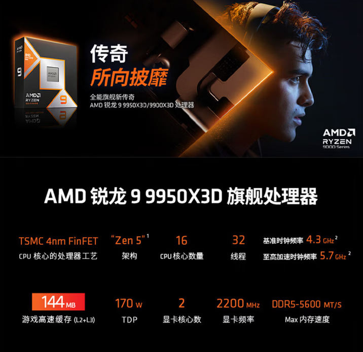 AMD 锐龙 R9-9950X3D 4.3GHz 16核 32线程 4370 4870