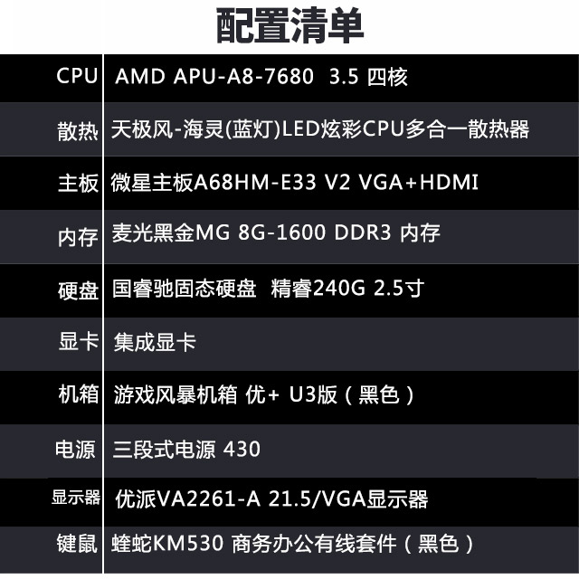 【A6-7680整机】AMD APU A8-7680 3.5G双核 /8G/240G/22英寸液晶全套整