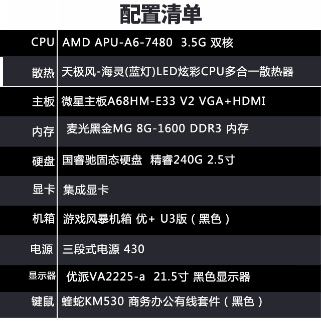 【A6-7480整机】AMD APU A6-7480 3.5G双核/8G/240G/22英寸液晶全套整机