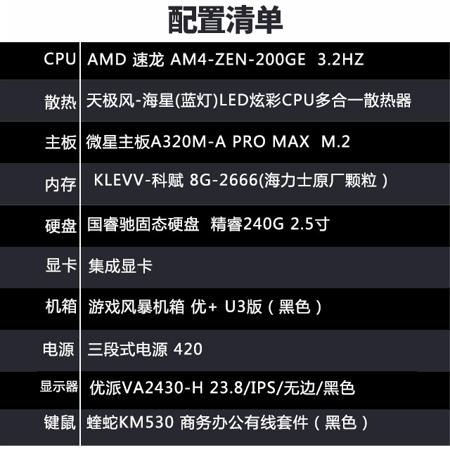 【AM4-ZEN-200GE整机】AMD 锐龙AM4-ZEN-200GE 3.2G/8G/240G/24英寸液晶全套整