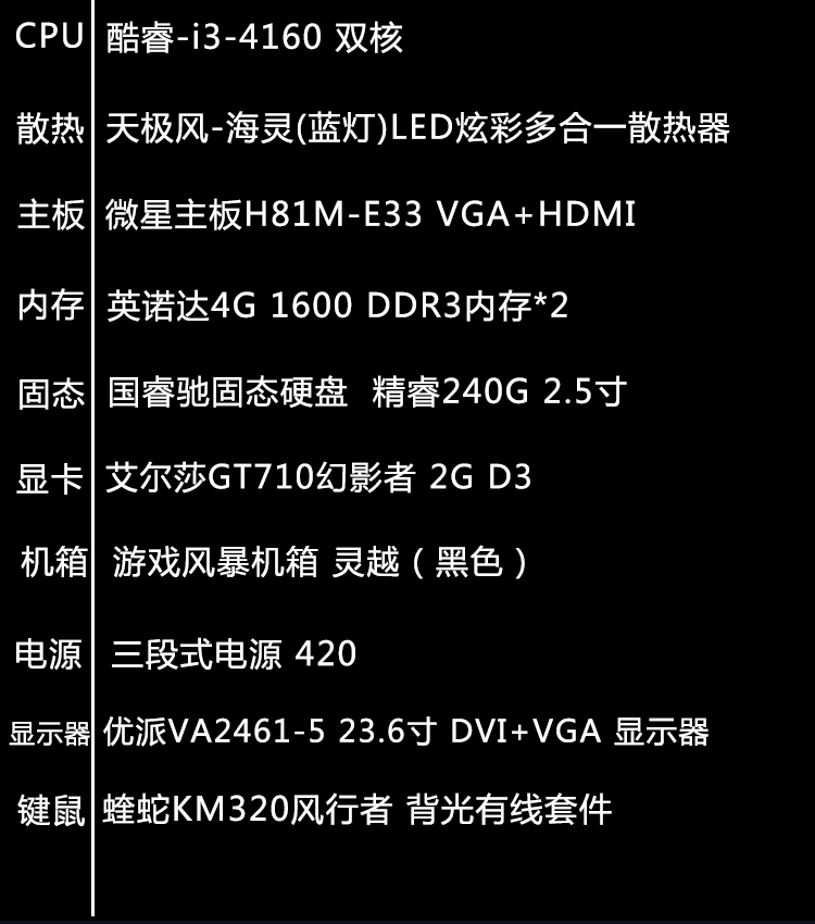【i3-4160整机】酷睿i3-4160/8G/240G/GT710 2G/优派23.6寸家用影音办公整机