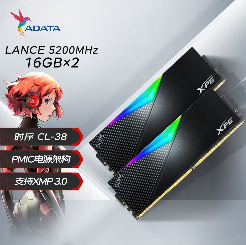 威刚XPG LANCER 32G(16G*2) DDR5 5200内存条 电竞RGB灯条
