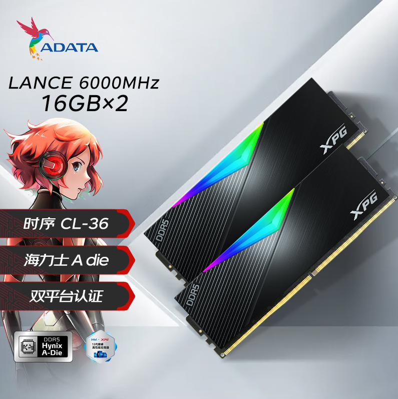 威刚XPG 龙耀 LANCER 32G(16G*2) DDR5 6000 CL36 海力士A die颗粒(黑)电竞RGB内存条