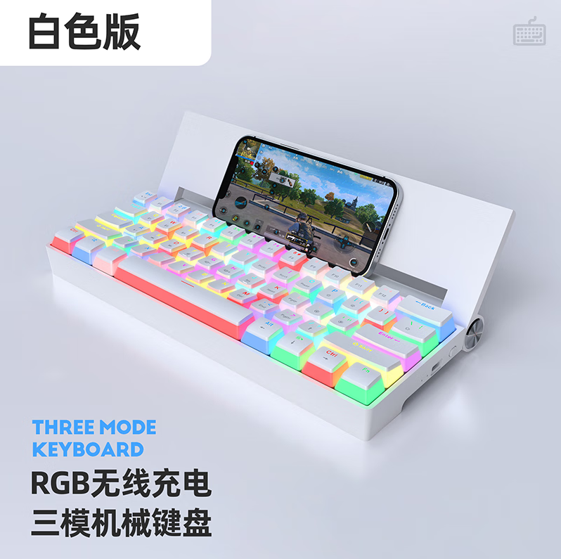 爱国心 GK618 白色布丁 2.4G无线蓝牙机械键盘 支持热插拔 双拼布丁键帽 可手机无线充电 三模青轴