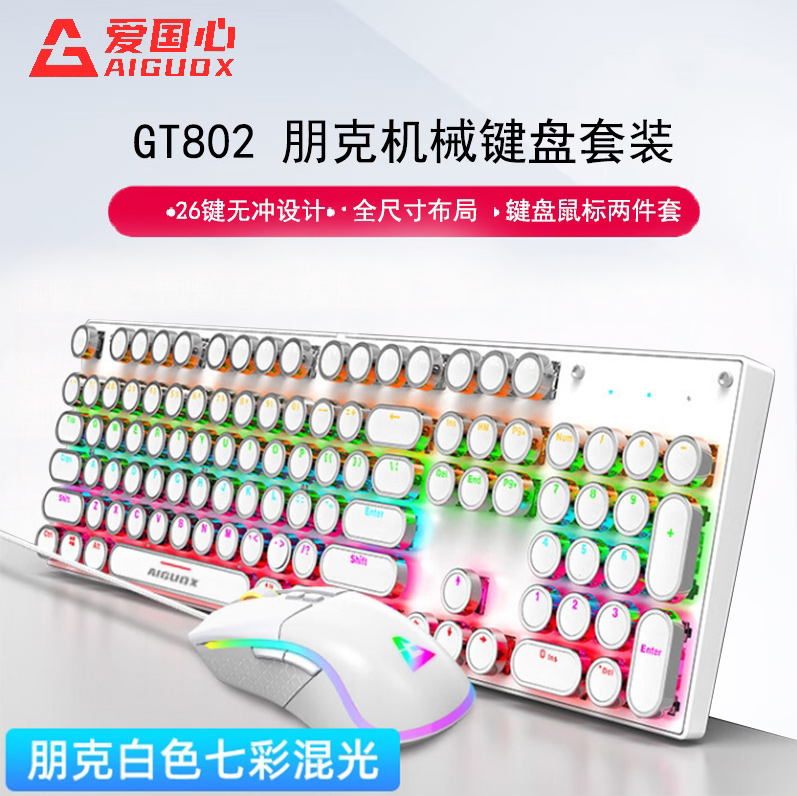 爱国心 GT802 青轴 机械键盘鼠标白色套装 电镀朋克键帽炫酷灯效 电脑电竞游戏机械键盘