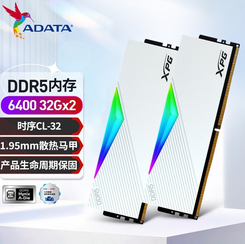 威刚(ADATA)XPG龙耀D500G 64GB(32GBX2)白色彩包套装 DDR5 6400 C32海力士A die内存条