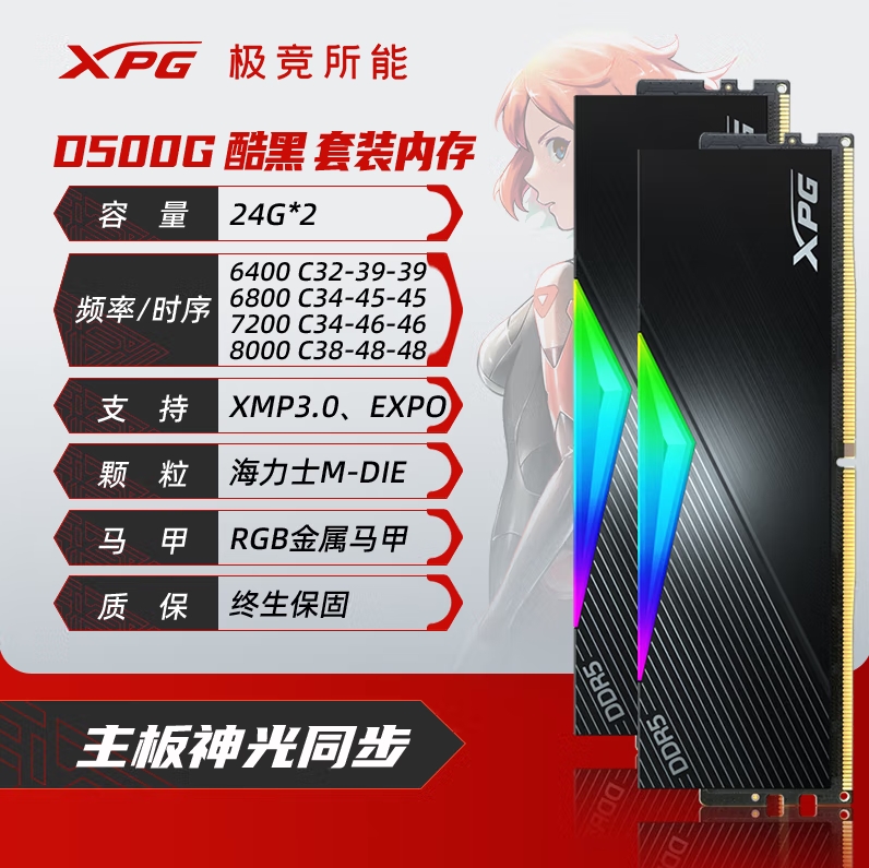 威刚XPG D500G 48G(24G*2) 6800 DDR5 DB500G (黑)RGB灯条台式电脑海力士A-DIE颗粒